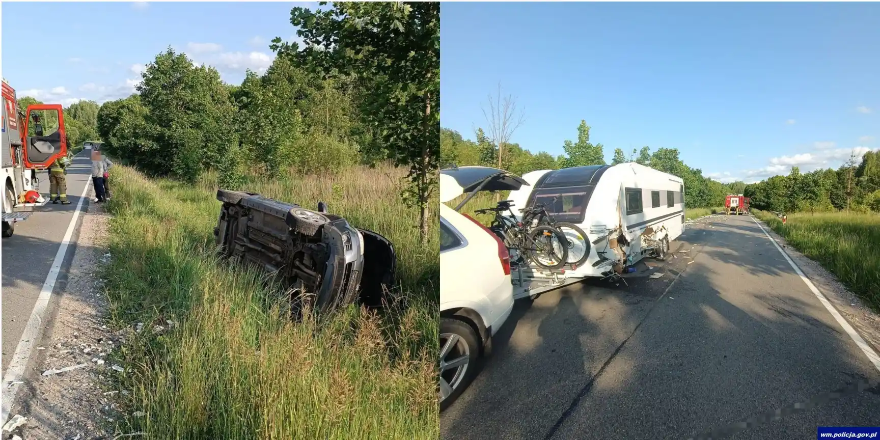 Jak informuje mrągowska policja, na prostym odcinku drogi kierujący samochodem osobowym marki Suzuki, mieszkaniec gminy Piecki, zderzył się z jadącym z naprzeciwka Volvo z przyczepą kempingową. W pojeździe Volvo znajdowały się cztery osoby, w tym dzieci w wieku 7 i 15 lat. Suzuki prowadził jedynie kierowca, który został przetransportowany do szpitala na badania – na szczęście nie stwierdzono u niego poważnych obrażeń.
